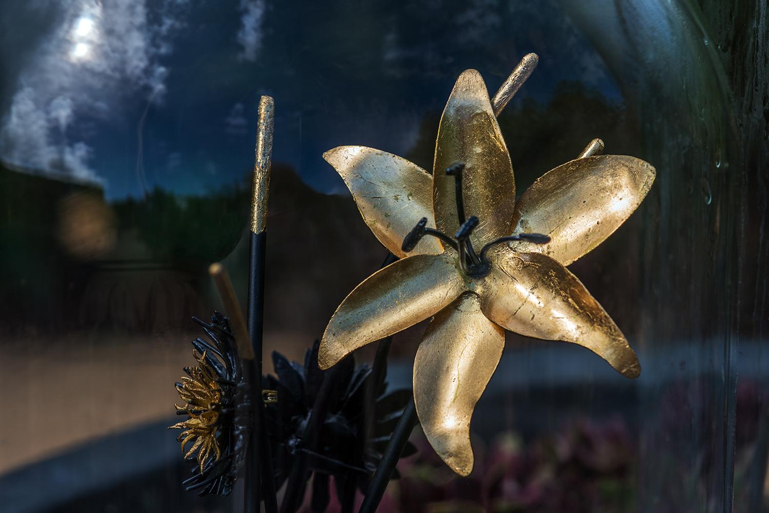 Tout est pensé, pour que le spectateur puisse s’émerveiller devant une pureté noire, le noir avec ses reflets bleus, bruns, rouges, sa texture veloutée, épineuse et luisante. Les plantes se dévoilent avec subtilité et délicatesse, le tout ponctué par des touches dorées.