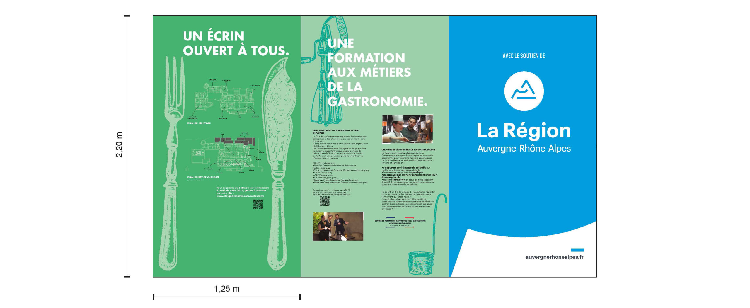 Dans le cadre de l’ouverture en septembre 2022 du CFA de la Gastronomie dans le Château de Lacroix-Laval à Marcy-l’Étoile (69), la création d’une exposition extérieure permet d’informer les visiteurs de parc du futur projet.